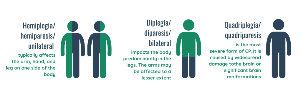 The term “Cerebral Palsy” originates from “cerebral,” meaning related to the brain, and “palsy,” indicating muscle weakness or movement issues because of brain damage affecting motor control. The Cerebral Palsy Foundation website has an abundance of information and resources on how to better understand the key differences between Hemiplegia, Diplegia and Quadriplegia highlighted by the below infographic.