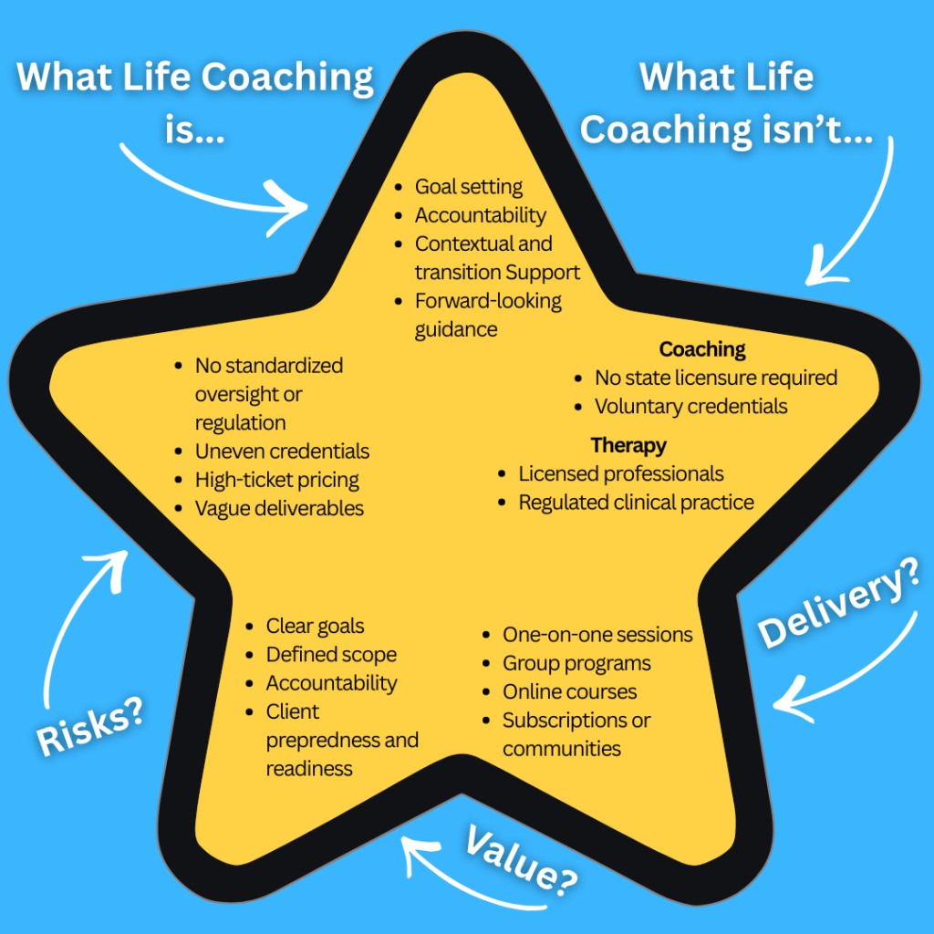 By contrast, problems tend to emerge when coaching relationships are poorly defined or driven by unrealistic promises. According to The New York Times, the life coaching industry’s rapid growth and lack of formal oversight contribute to high-pressure sales practices and costly programs that, in some cases, leave clients facing financial strain when promised outcomes fail to materialize. These dynamics fuel broader concerns about consumer protection and accountability within the field.