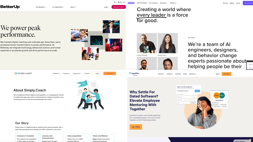 Digital platforms are central in how coaching services are packaged and delivered at scale. Companies such as BetterUp focus on enterprise and individual professional development, while tools like Simply.Coach provide infrastructure that allows independent coaches to manage clients, programs and pricing. Other platforms, including Together, emphasize organizational mentoring and matching systems. Newer digital-first services such as Helloable illustrate how coaching is increasingly delivered online across industries and geographies.